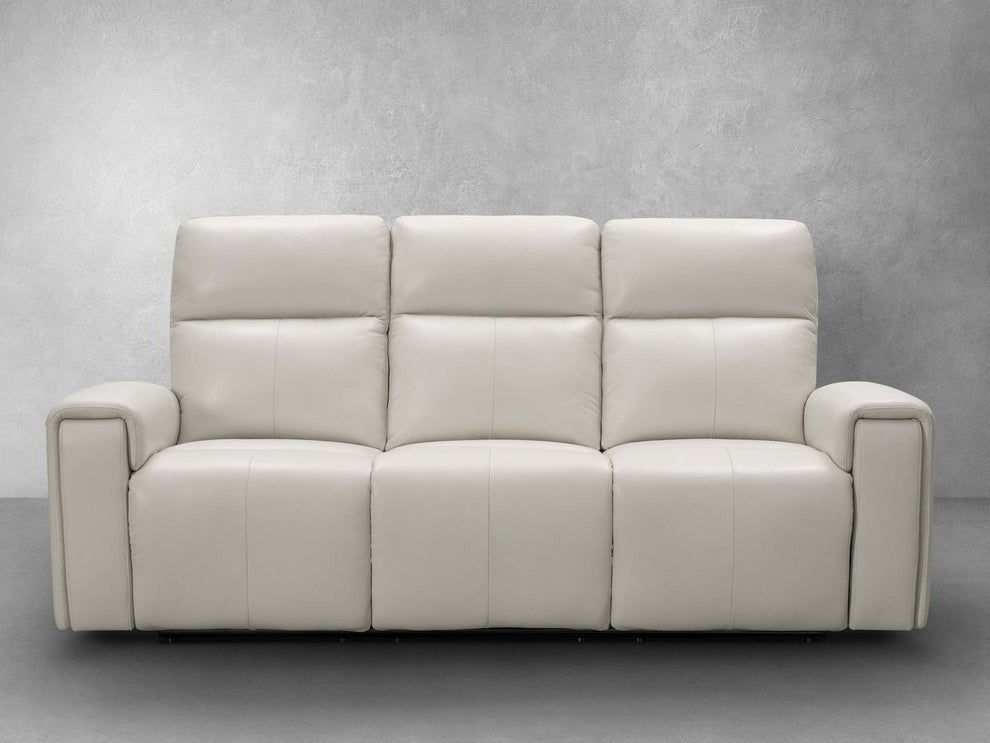 Sleek modern design paired with the magic touch of technology, introducing the Keegan Power Reclining Leather Sofa. This collection offers ultimate comfort with its high-density foam cushions wrapped in a beautiful ivory or brown top-grain leather, a reclining feature at the press of a button, and power headrests. On each reclining side is a USB port to charge your mobile devices while you recline and relax.