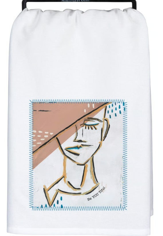 A 1980s Memphis-inspired cotton kitchen towel created at the Friendship Heart Gallery in downtown Lancaster, PA featuring a panel stitched accent and subtle "Be YOU Tiful" sentiment with geometric designs and woman illustration in a blush, blue, and gold palette. Complements well with other Memphis style collection pieces. Machine-washable. About the Artist: Meticulous and focused, Sarah often stays a few minutes after her studio classmates have left to finish a painting. She enjoys abstract and realistic artwork, and loves to incorporate her favorite color, green. A portion of the proceeds from this sale will be donated back to the gallery to support their mission to promote local artists with intellectual disabilities and autism.