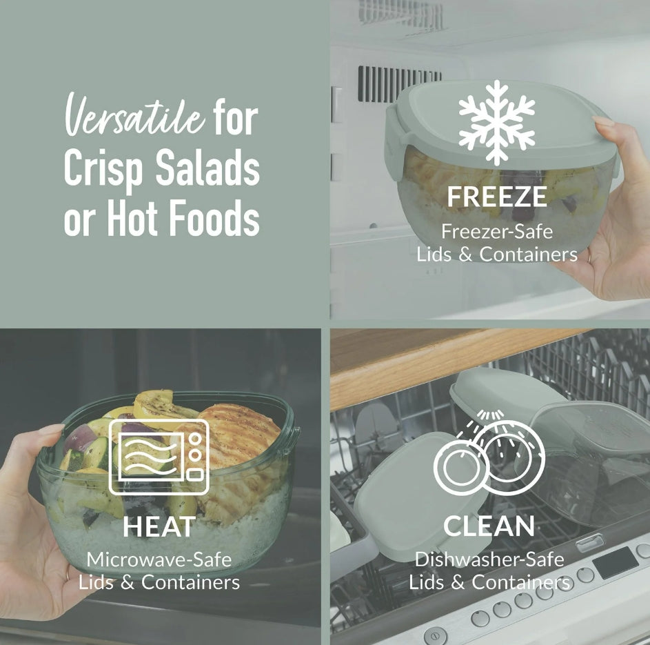 The Bentgo All-in-One Tinted Glass Salad Bowl is ideal for enjoying fresh and healthy meals at work or on-the-go. The large 7.6-cup colored glass bowl is perfect for greens, while the removable tray allows you to pack all your toppings separately. Additionally, there's a 3-ounce container to keep your dressing separate until mealtime. You can even mix your salad right in the bowl; just add your ingredients, lock the lid, and shake to mix. The airtight lid keeps everything mess-free.