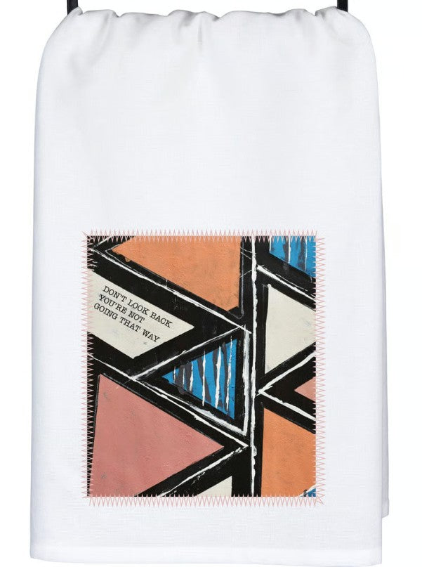 A 1980s Memphis-inspired cotton kitchen towel created at the Friendship Heart Gallery in downtown Lancaster, PA featuring a panel stitched accent and subtle "Don't Look Back - You're Not Going That Way" sentiment with geometric designs in a blush and blue palette. Complements well with other Memphis style collection pieces. Machine-washable.About the Artist: Michelle loves learning new ideas for creating, and uses a variety of techniques in her realist and abstract artwork. Always interested in the well-being and happiness of others, she enjoys sharing with her fellow artists and offering words of encouragement. A portion of the proceeds from this sale will be donated back to the gallery to support their mission to promote local artists with intellectual disabilities and autism.