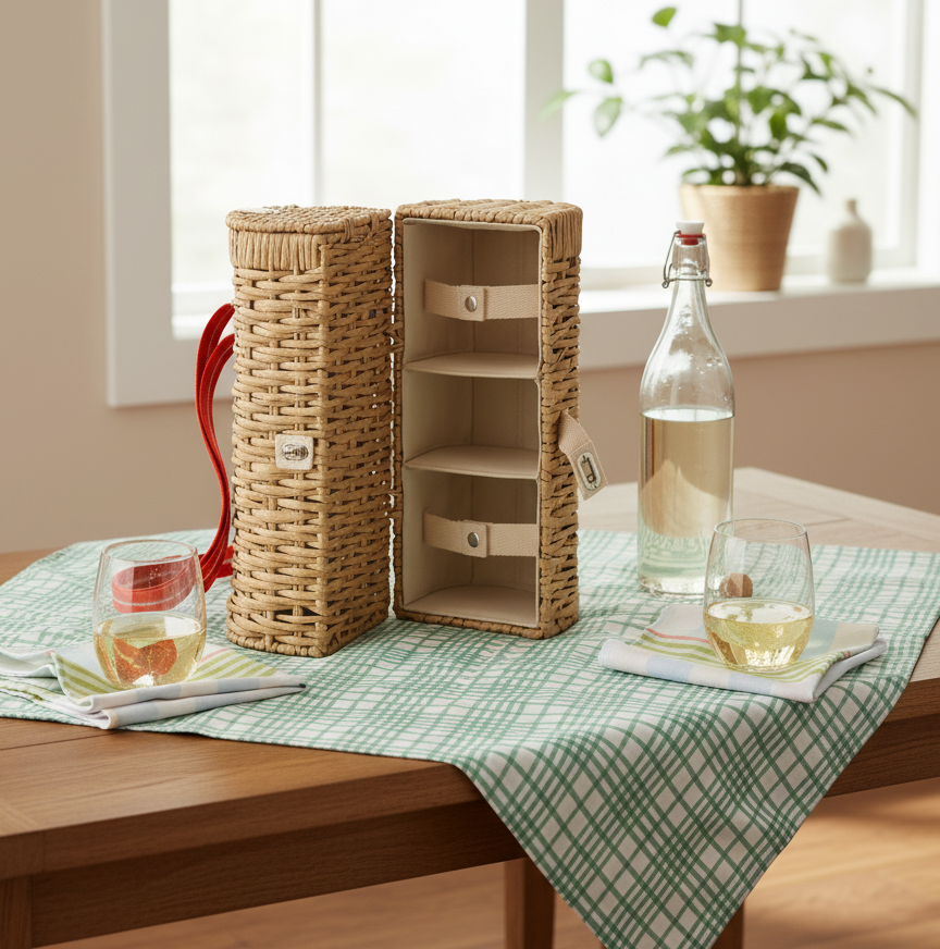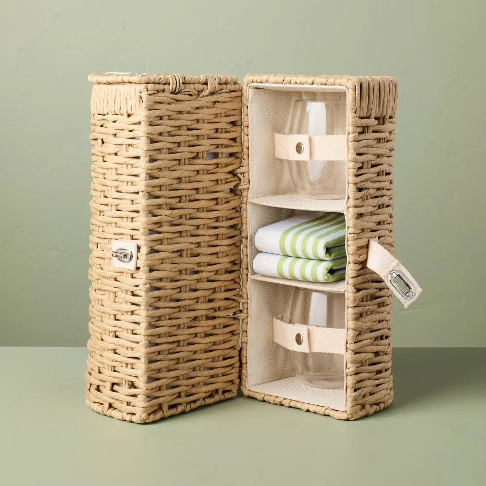 This Woven Paper Bottle Carrier from Hearth & Hand with Magnolia is a perfect pick for picnics. This bottle carrier is covered with brown paper and woven in a rattan-like pattern for a natural look. It features two compartments — one spacious compartment with snap closure to hold a water bottle, and another compartment with three sections to keep glasses and napkins. Featuring an adjustable strap for easy carrying, it also boasts a latch closure to hold the items securely.