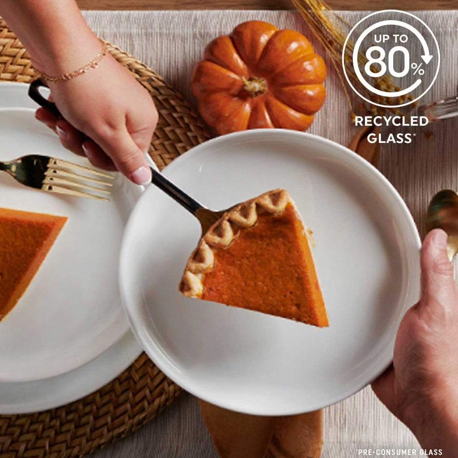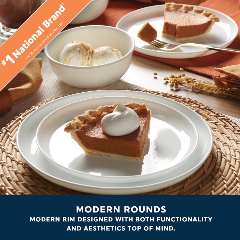 The Corelle 12-piece Modern Round white dinnerware set combines beauty and functionality with sleek curves designed for style and comfort. The understated rim elegantly frames food while containing sauces to prevent spills. This classic white dinnerware set transitions seamlessly from everyday family meals and simple one-plate dinners to casual get-togethers and special occasions.
