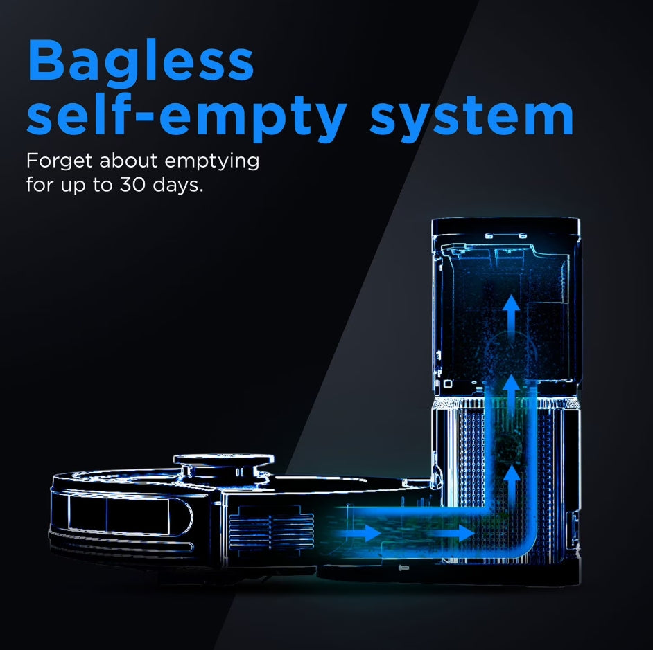 With Matrix Clean, the robot vacuum cleans using a precision grid, taking multiple passes over dirt and debris, ensuring no spots are missed. After each cleaning session, the robot empties itself into a bagless base, which can hold up to 30 days of dirt and debris.