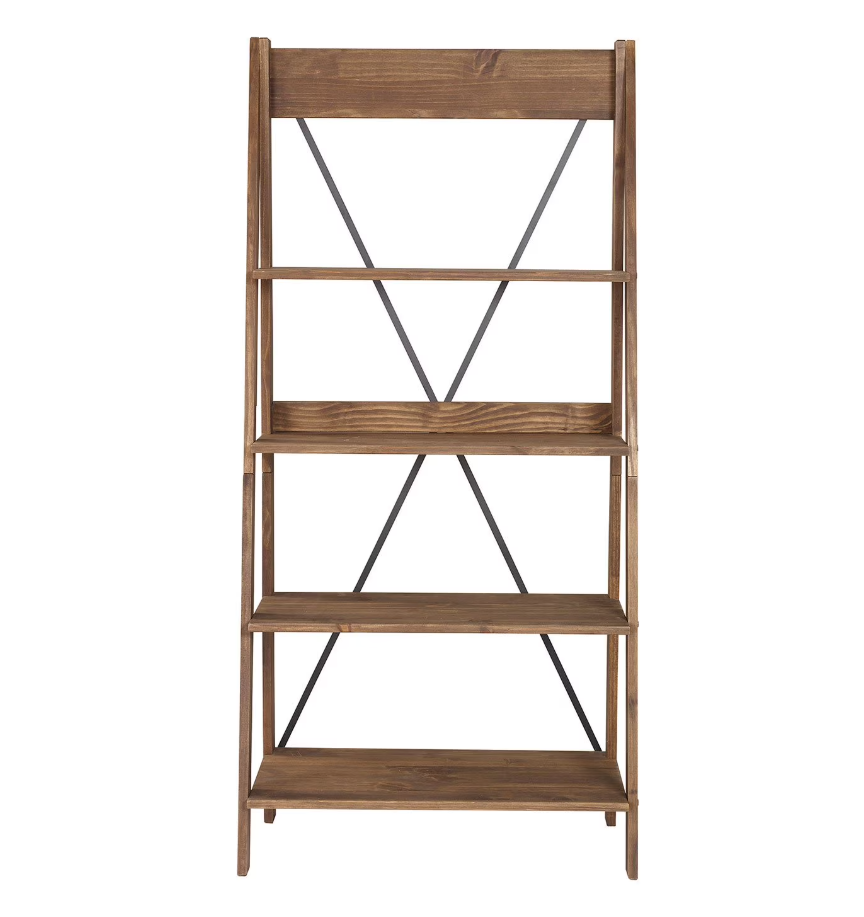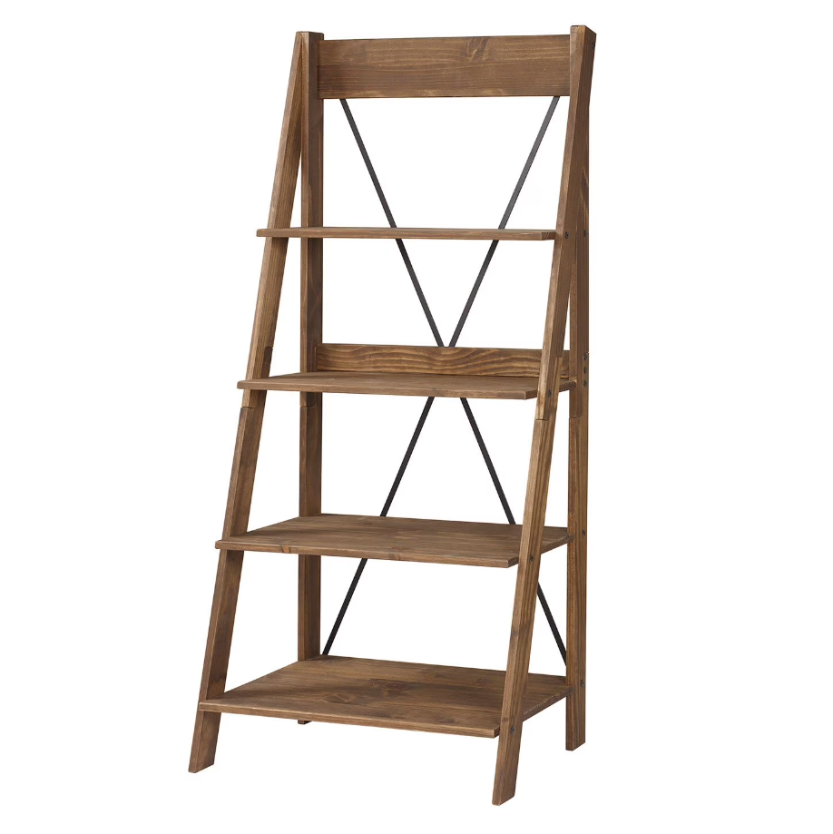 The Walker Edison Solid Wood Ladder Bookshelf in brown offers the perfect blend of modern farmhouse elegance. Powder coated metal "X" frame backing detail gives this bookcase a touch of urban flair. Its open storage shelves, four in total, run along an angled frame, generating a waterfall layered effect. And with a responsibly harvested solid pine frame, this bookshelf offers you eco-friendly peace of mind.