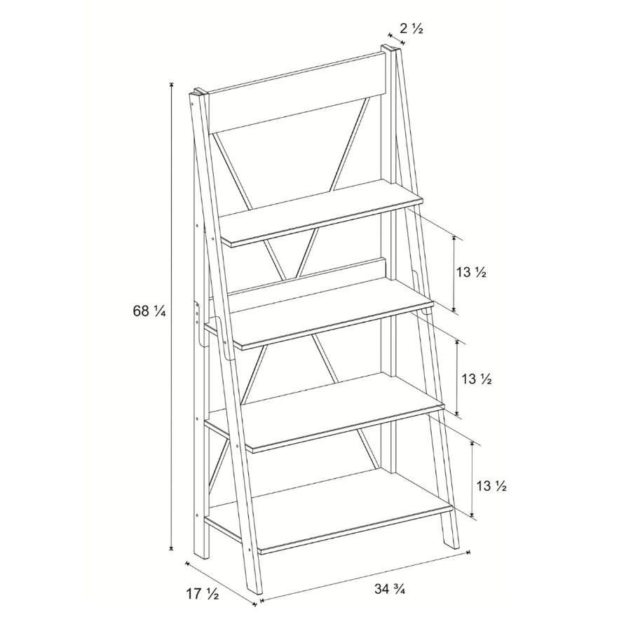 This straightforward bookshelf blends well with a variety of home decor styles. So, welcome this industrial farmhouse beauty into your living room, bedroom or home office. With overall assembled dimensions of 68" in height by 34" long by seventeen inches wide.