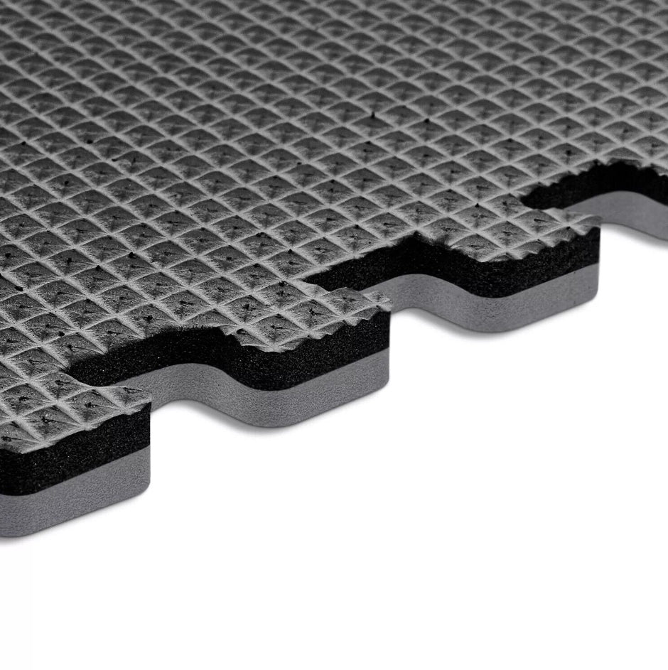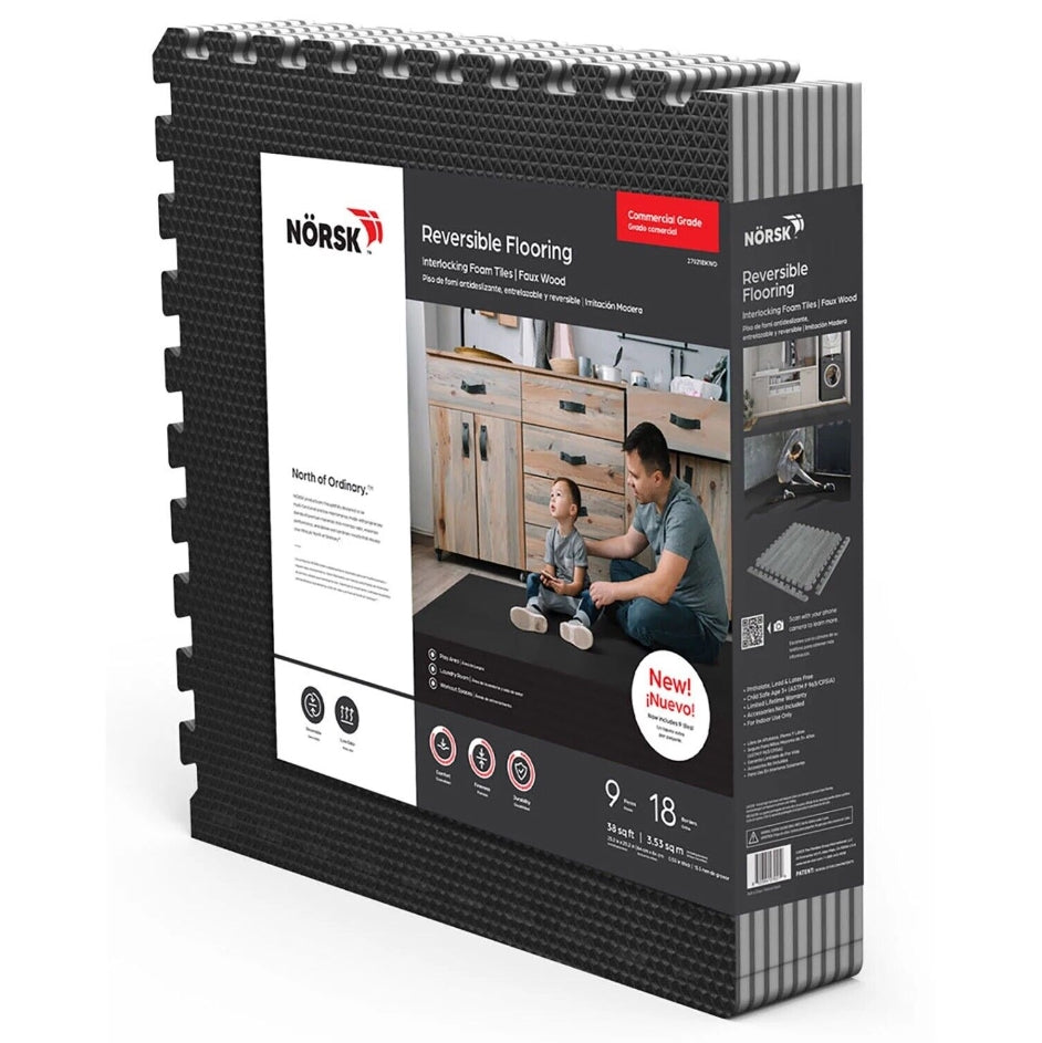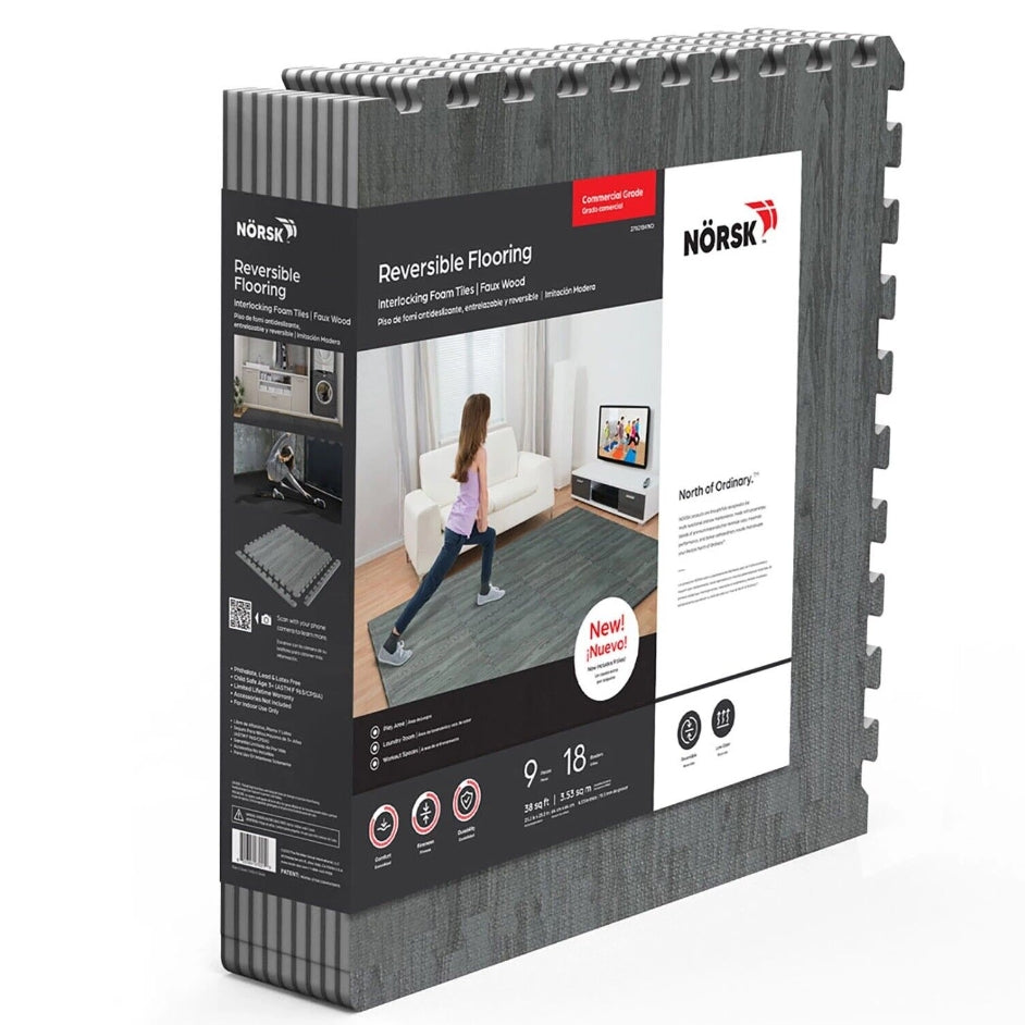 Introducing the Norsk 25" x 25" Reversible Foam Flooring, a must-have for any space that needs durable and protective flooring. This multipurpose flooring is perfect for home gyms, kids' playrooms, laundry rooms, and any area that requires a soft, shock-absorbent flooring solution. Each tile is 0.53 inches thick and provides increased cushioning to help protect your joints during high-intensity workouts. The anti-slip grip on both sides ensures enhanced safety, while the added texture on one side provides extra cushioning. Constructed with lead-free, latex-free foam, this child-safe Norsk anti-fatigue foam flooring is perfect for homes with kids. It includes nine tiles that cover up to 38 sq. ft., making it a practical choice for small to medium-sized spaces. Cleaning this flooring is easy and hassle-free. Simply use soap and water after each use to keep it looking new. The lightweight tiles can be easily moved into the closet, freeing up space in your room. This reversible foam flooring comes with nine tiles and 18 trim pieces, making it easy to add edges and customize the matting to your space. The intuitive design ensures you can put together the pieces quickly and effortlessly.