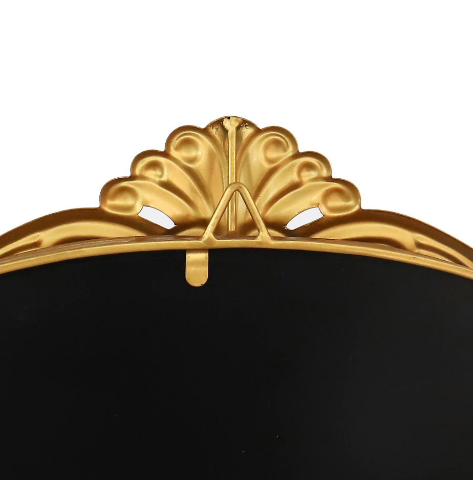 The frame is made from durable iron, built to last. It features a beautiful filigree centerpiece on the top, adding a touch of vintage charm. The mirror comes in a rich gold finish, providing a regal and sophisticated look that complements any décor.