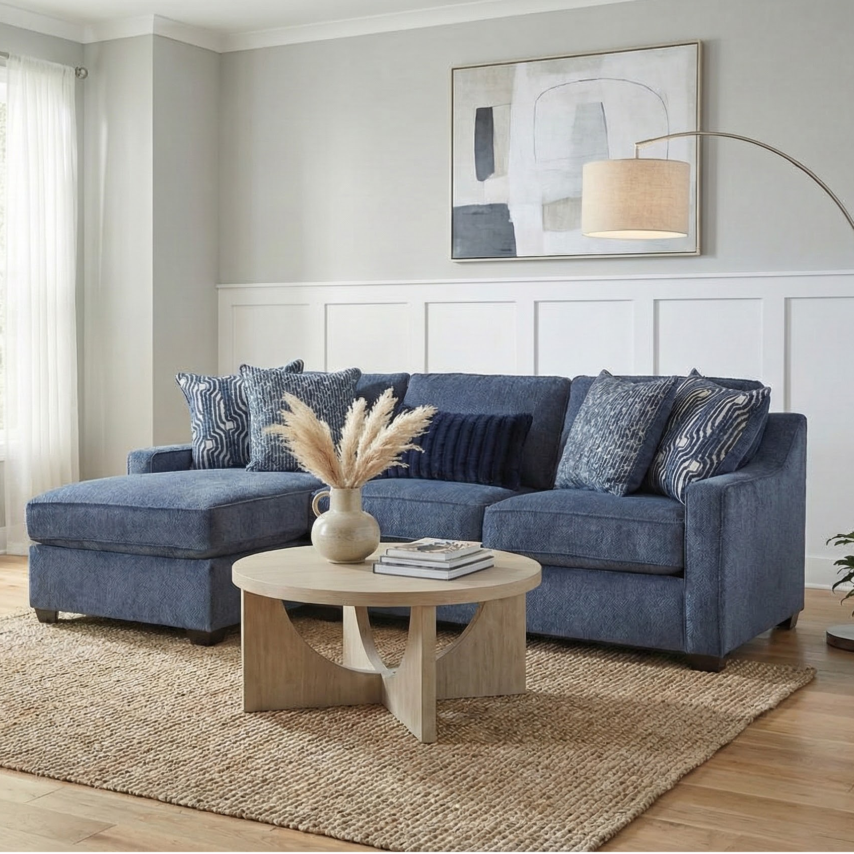 Anchor your living space with the rich color and inviting design of the Bowmore Sofa with Chaise in Navy. This sofa provides the perfect blend of style and lounging comfort, featuring a deep blue upholstery, tailored arms, and an integrated chaise for ultimate relaxation.