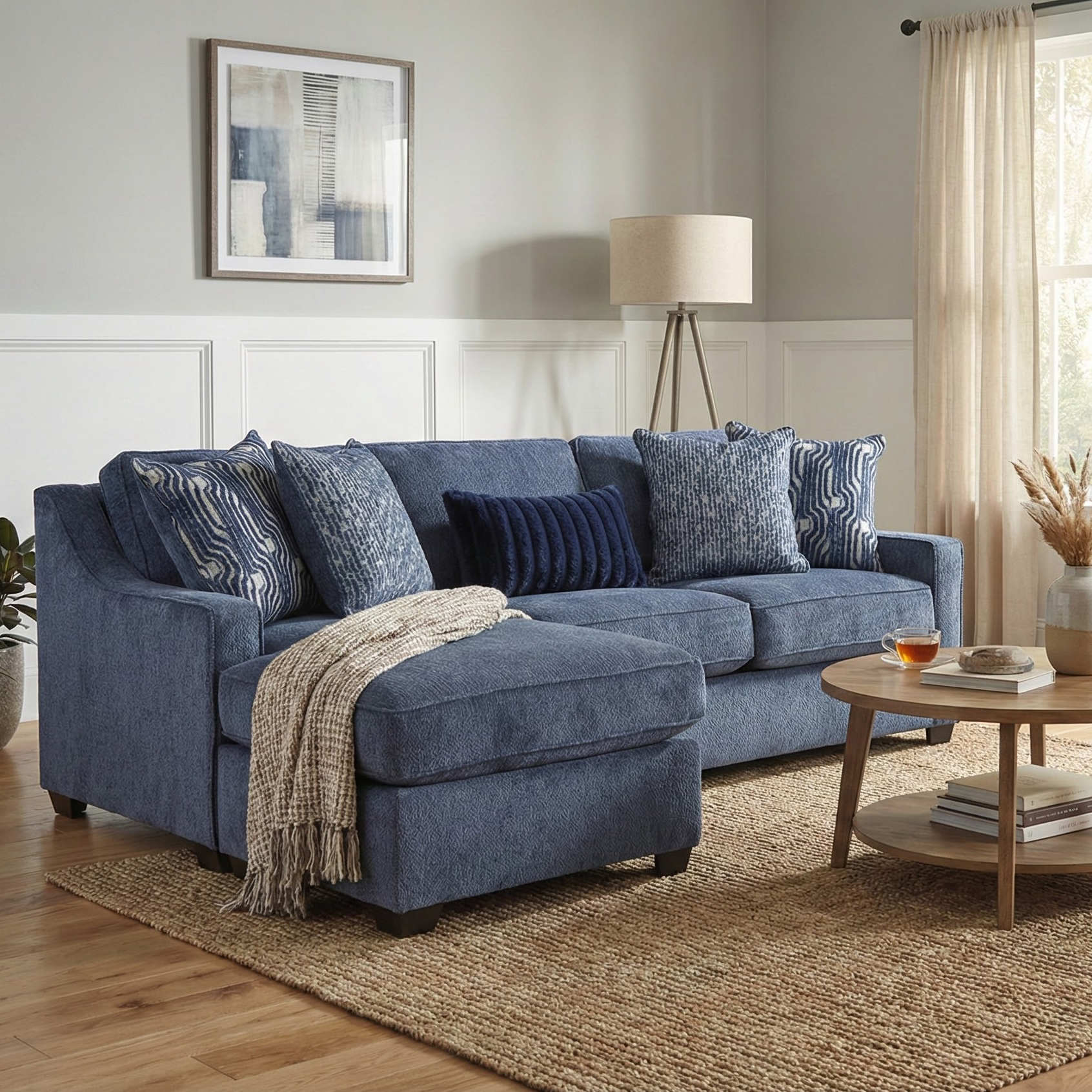 The Bowmore Sofa with Chaise is a stylish and functional centerpiece, delivering the spacious comfort of a sectional in a refined, deep blue hue.