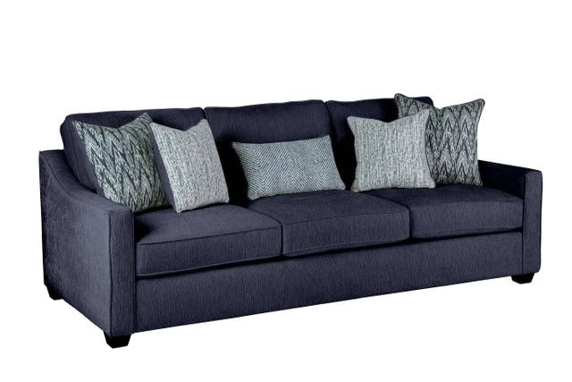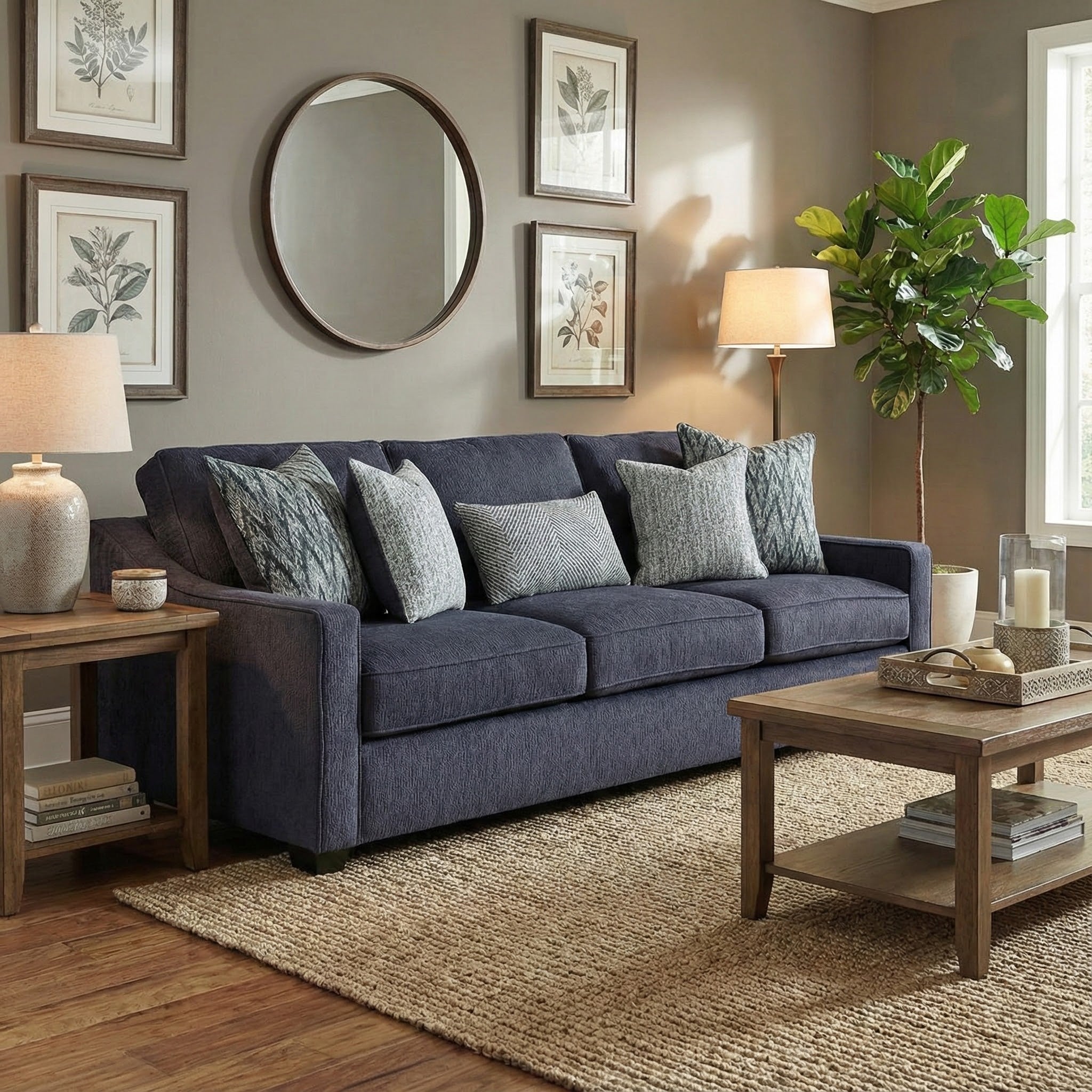 Coordinating Accent Pillows: Includes a selection of decorative toss pillows (as pictured) in coordinating blues and grays, featuring patterns and textures that enhance the sofa's refined appearance.
