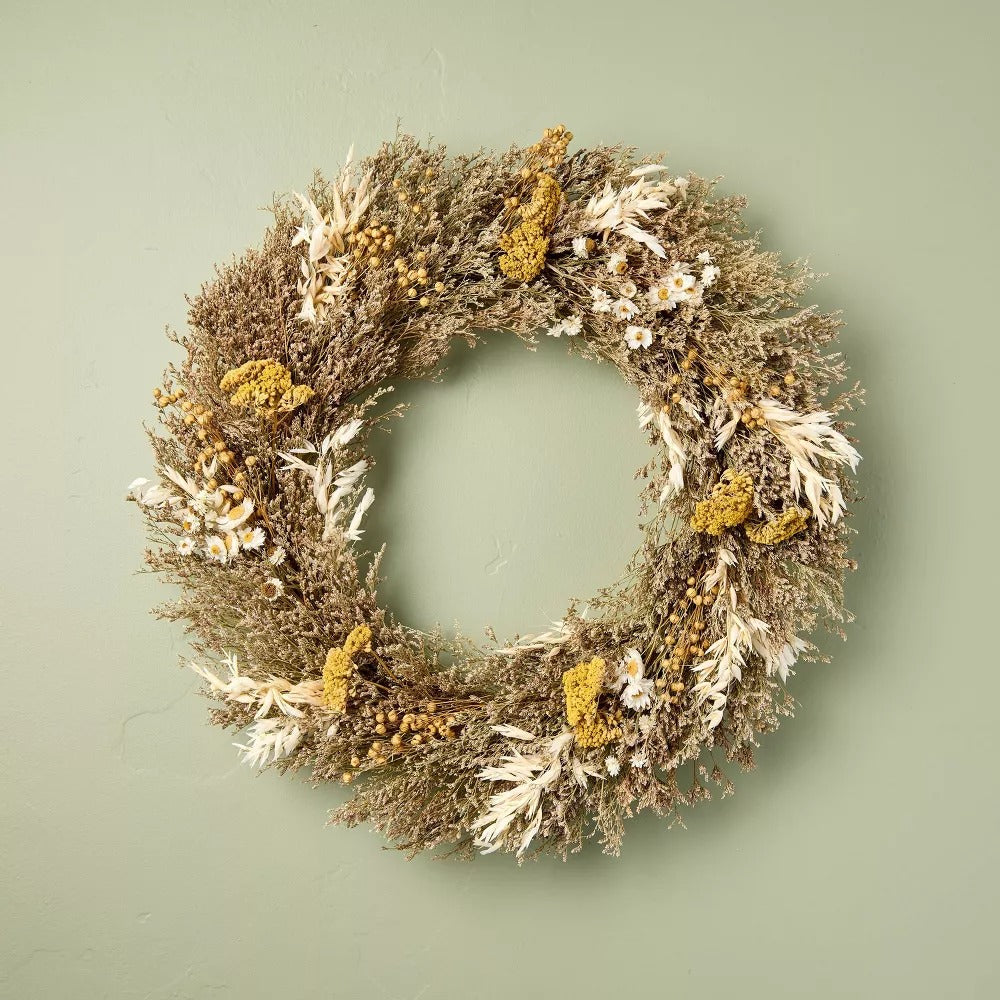Bring natural charm to your decor with this Preserved Spring Grass and Flower Wreath from Hearth & Hand™ with Magnolia. This spring wreath is made of preserved flowers and dried grass that adds an earthy, raw finish to your decor. Designed in a circular shape, this wreath features a hanging loop for easy placement on doors or above the mantel.